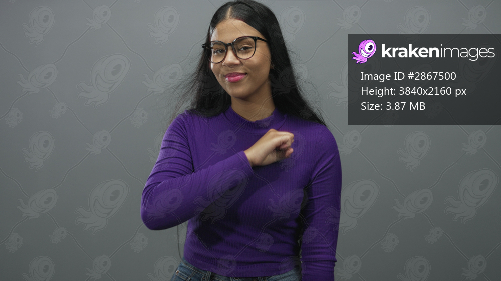 Young latin woman with long black hair wearing glasses and purple top taps fist to chest in studio; confidence.