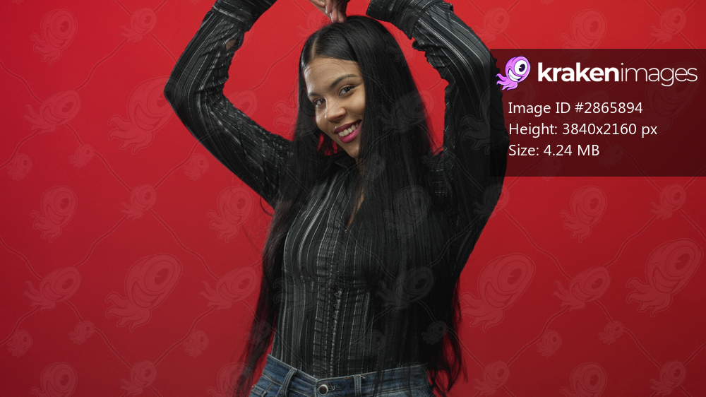 Young latin woman with long dark hair smiling and forming heart gesture with hands in red studio; love unity romance affection.