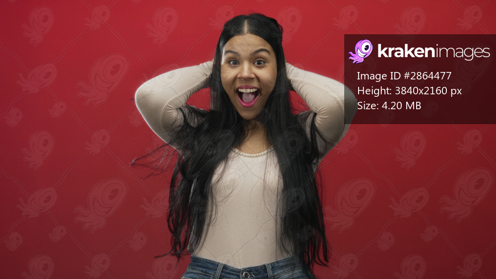 Young latin woman with long hair and open mouth covering ears against red backdrop in studio; surprise.