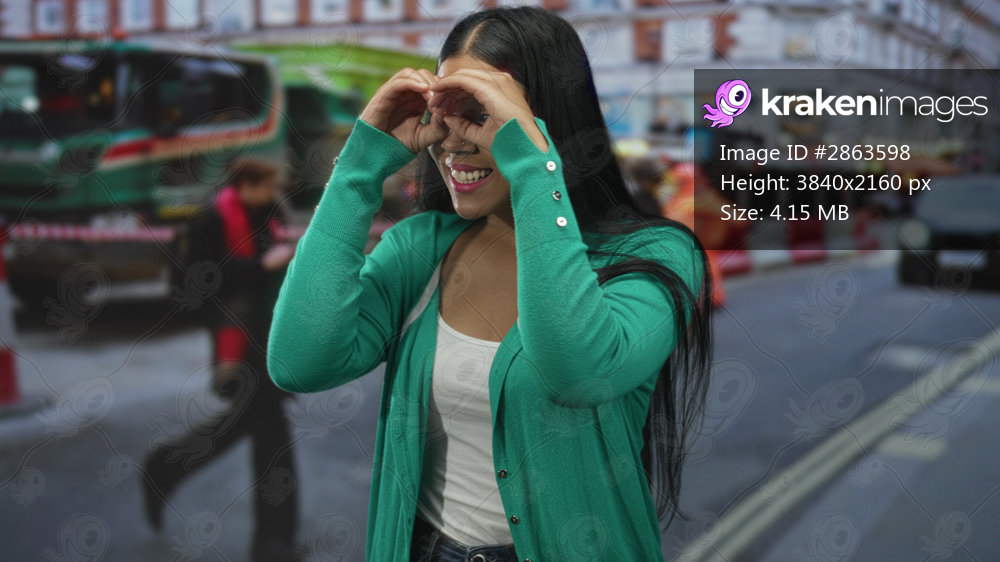 Young latin woman makes binocular gesture with hands on busy urban street in front of building facade; playful curiosity.