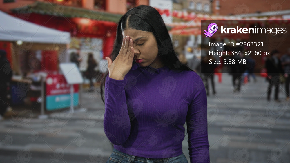 Young latin woman making pinched fingers gesture on crowded urban street lined with market stalls; confusion.