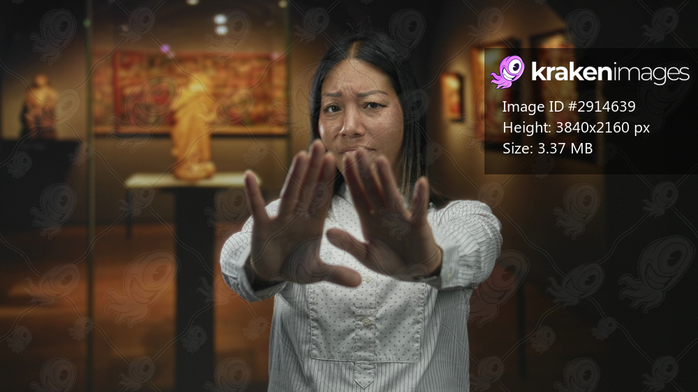 Young latin woman with palms forward, hands raised toward camera in an art gallery exhibit, standing near sculpture and framed paintings; guarded defiance. - Kraken Images