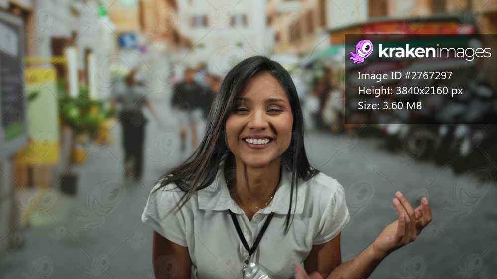Young latin woman playfully mimicking guitar playing in a lively street with blurred people and shops in the background, exuding happiness and energy.