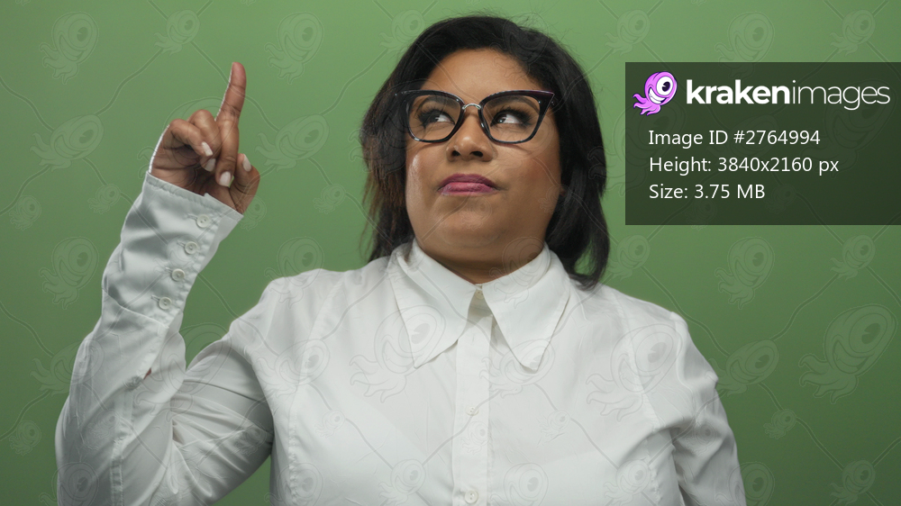 Young latin woman pointing upwards with a disgusted expression in front of a green wall.