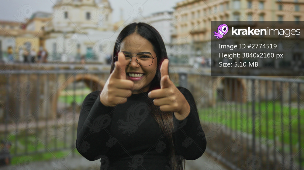 Young latin woman posing playfully in front of roman ruins on a sunny day, smiling confidently with buildings in the background and pointing fingers.