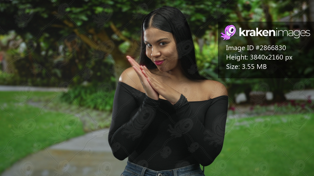 Young latin woman rubbing her hands together in a green public park walkway; anticipation readiness motivation planning.