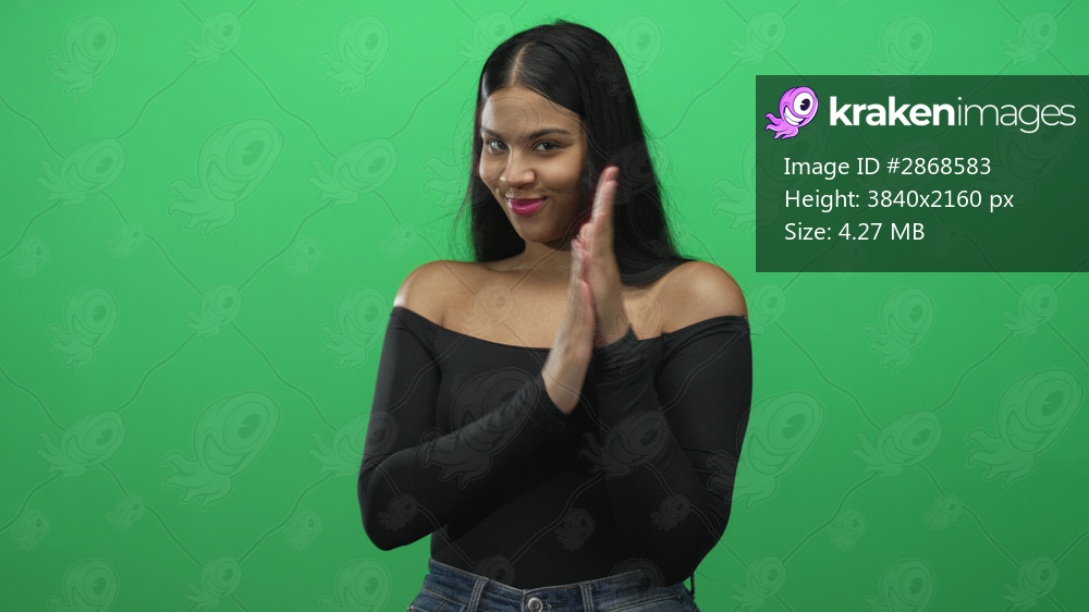 Young latin woman rubs her hands together in a bright green studio environment while smiling subtly and leaning forward; anticipation.