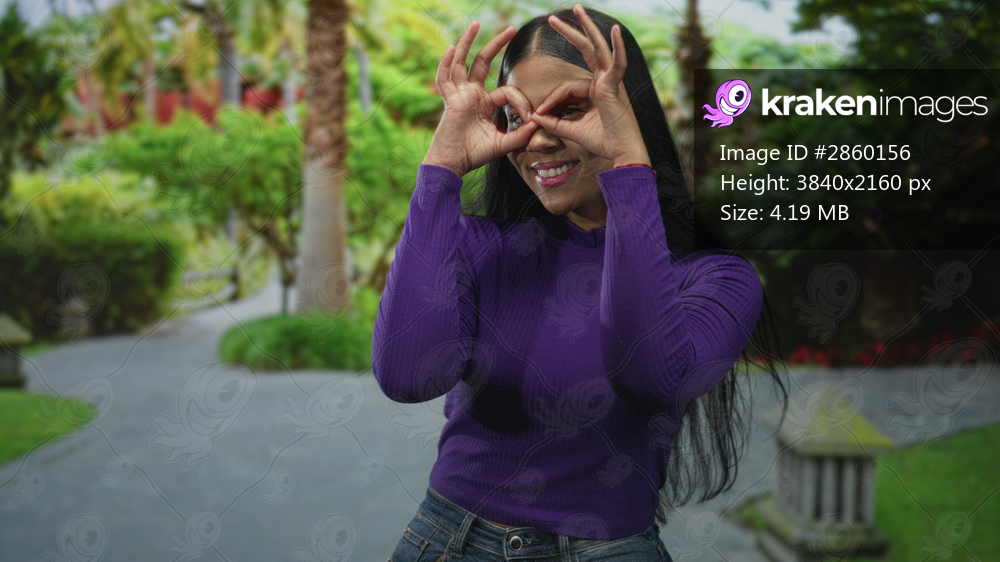 Young latin woman smiles and makes hand binoculars gesture in green forest by a winding path; curiosity.