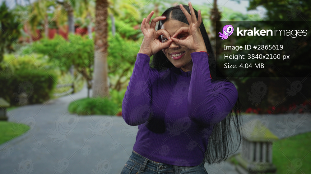 Young latin woman smiles and makes hand binoculars gesture in green forest by a winding path; curiosity.