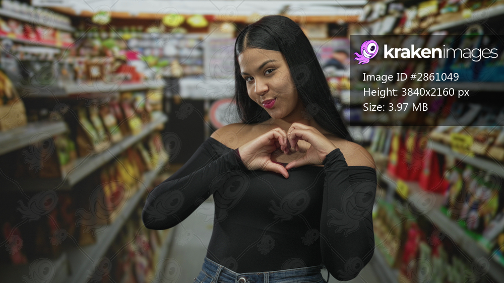 Young latin woman smiling forms heart shape with hands in colorful supermarket aisle with fresh groceries; affection.