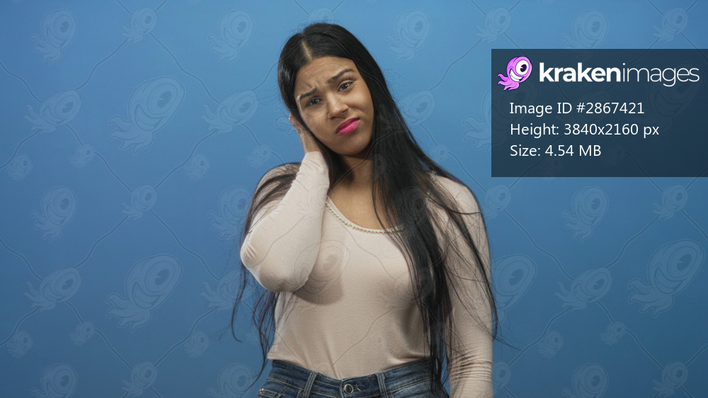 Young latin woman touching neck in studio with blue wall, wearing beige top and denim jeans; discomfort.