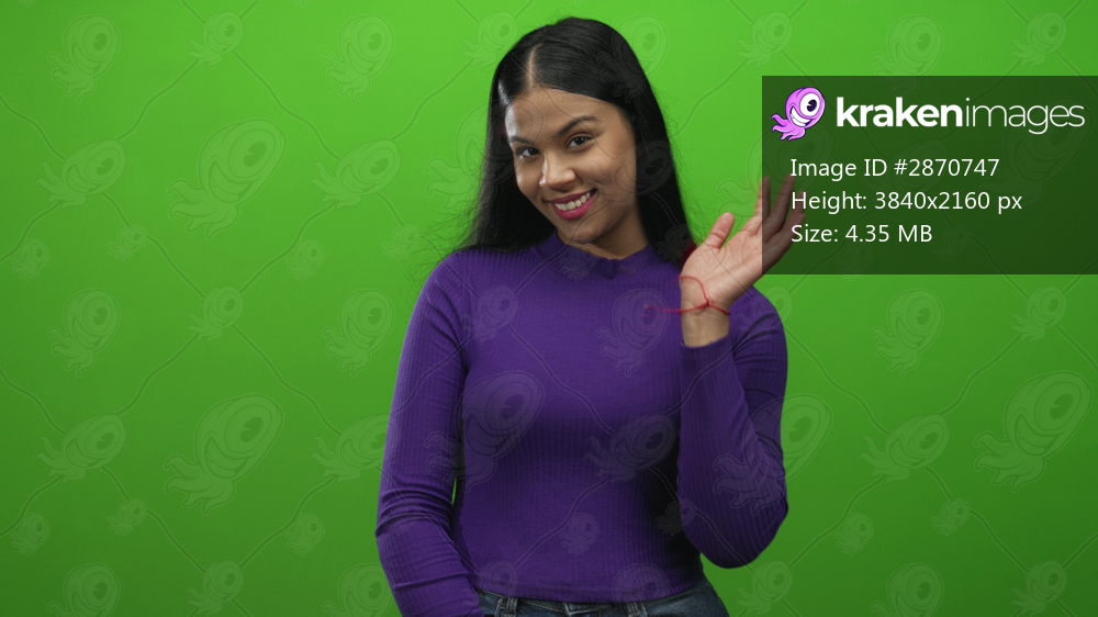 Young latin woman waving hand in studio green screen wearing purple top and denim jeans smiling at camera; friendliness.