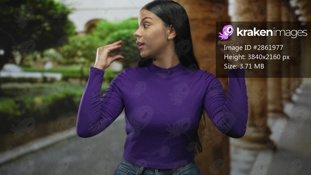 Young latin woman wearing a purple shirt with hands talking gesture in a building hallway; communication expression connection enthusiasm.