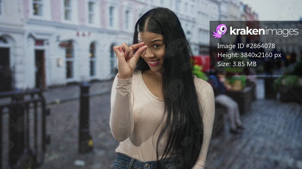 Young latin woman wearing beige top pinches fingers and smiles on street amid building facade under evening lights; teasing.