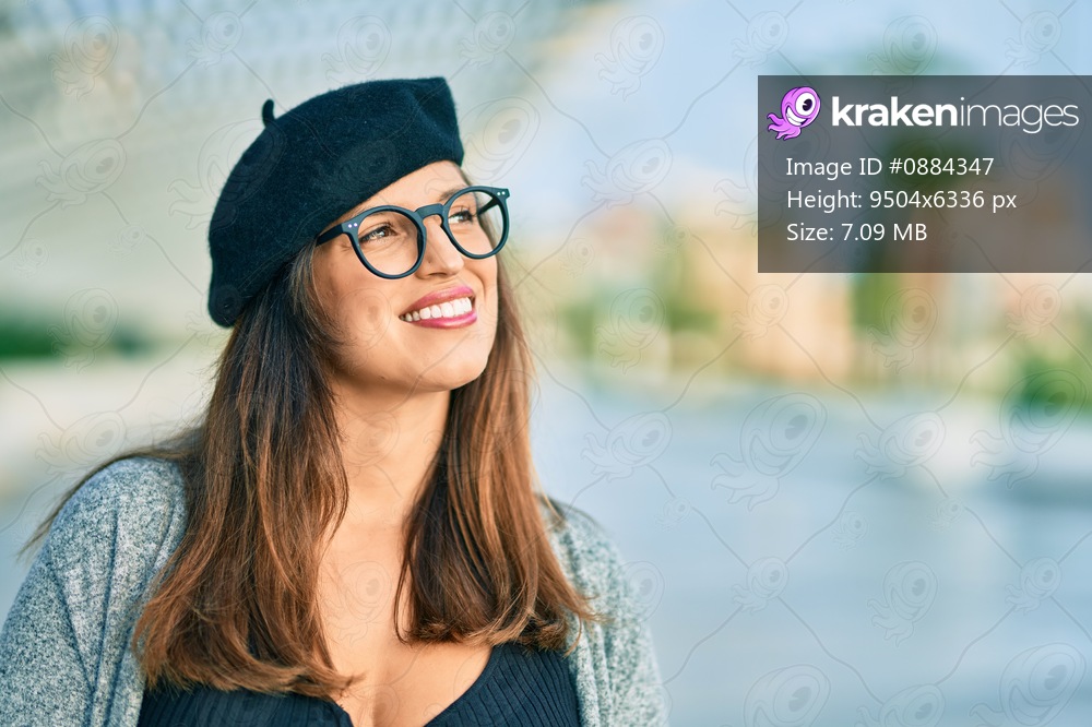Young latin woman wearing french style standing at the city.