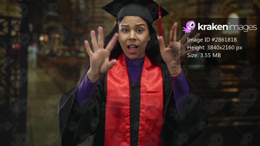 Young latin woman wearing graduation cap and gown uses a calling hand gesture in a historic church building; aspiration.