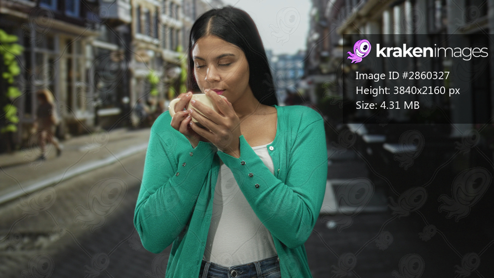 Young latin woman wearing green cardigan holding coffee cup on city street looks up with thoughtful expression; quiet contemplation.