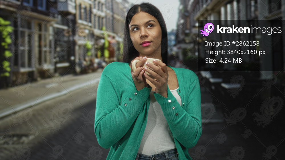 Young latin woman wearing green cardigan holding coffee cup on city street looks up with thoughtful expression; quiet contemplation.