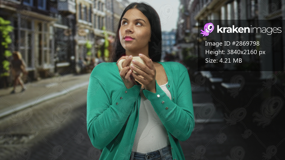 Young latin woman wearing green cardigan holding coffee cup on city street looks up with thoughtful expression; quiet contemplation.