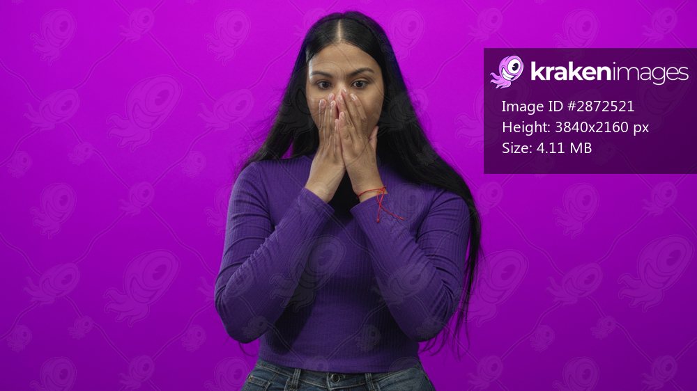 Young latin woman wearing purple top covering mouth gesture in studio with purple backdrop; surprise.