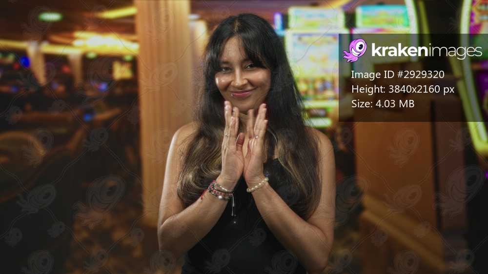 Young latina brunette woman claps hands at slot machine in casino building smiling with closed eyes and bracelets; luck joy.