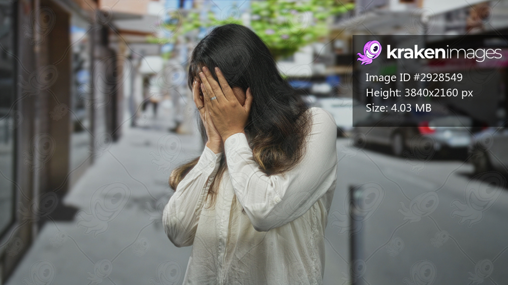 Young latina brunette woman covering her face with both hands while standing on a city street near parked cars and storefronts; anxiety.