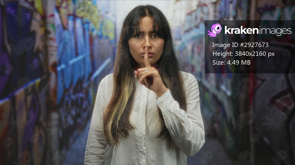 Young latina brunette woman with finger to lips for silence in a graffiti covered city street alley; urban secrecy.