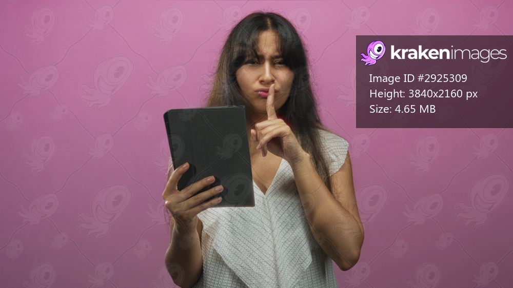 Young latina brunette woman holding a black tablet and raising index finger to lips in pink studio; secrecy.