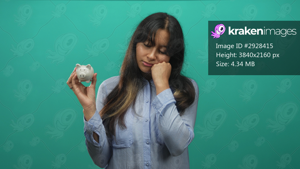 Young latina brunette woman holding a piggy bank with hand on chin in studio against teal background; financial worry.