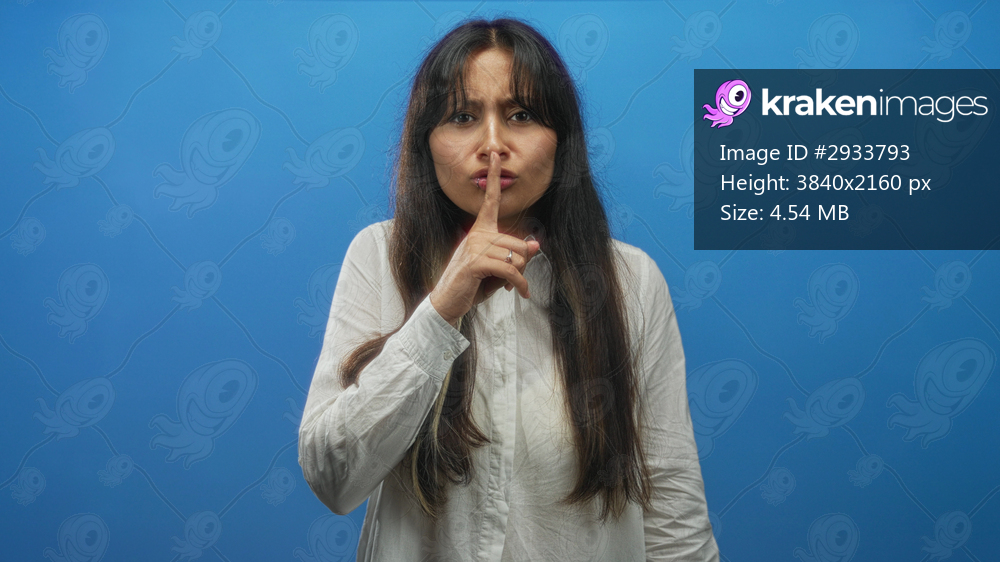 Young latina brunette woman in white shirt holding index finger to lips gesture in studio before a blue backdrop; silence secret quiet.
