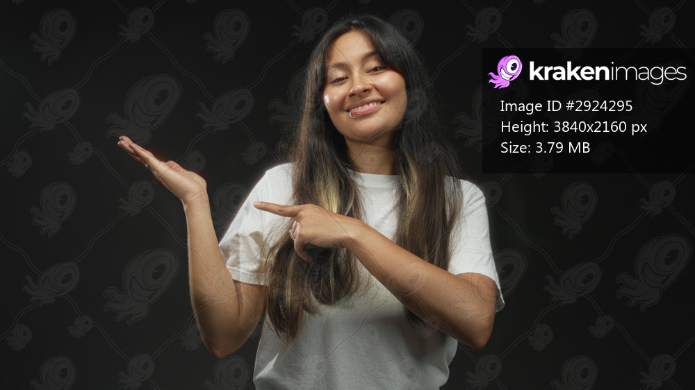 Young latina brunette woman in white tshirt pointing with open palm and smiling in black studio setting; joyful confidence.