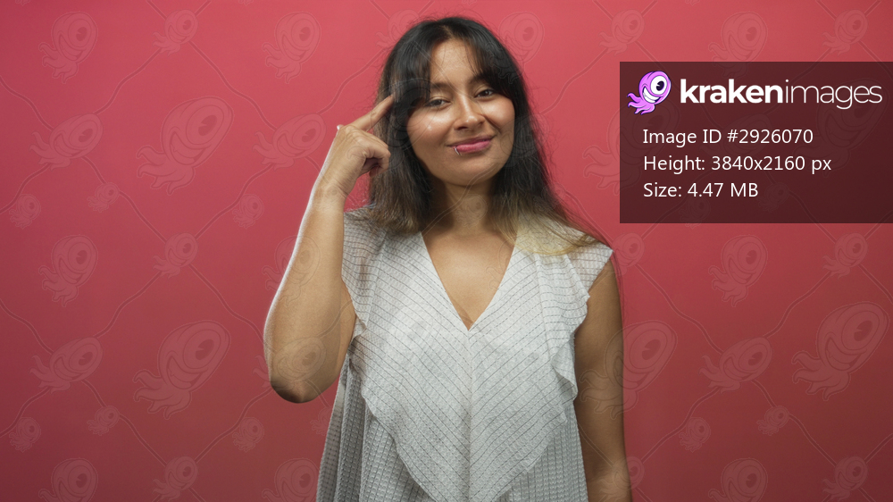 Young latina brunette woman points finger to temple while smiling in studio with pink backdrop wearing white blouse and lip piercing; thinking.