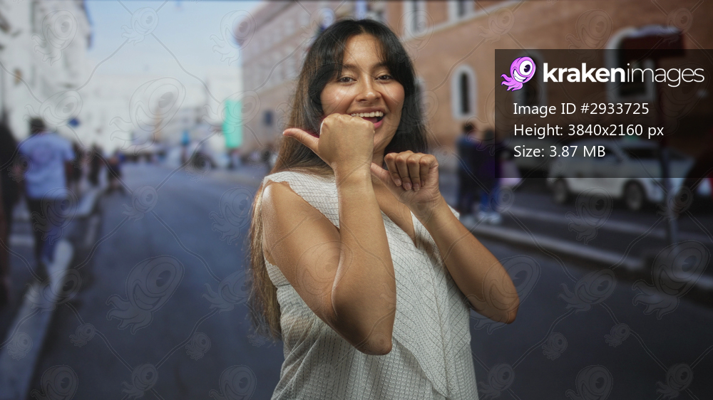 Young latina brunette woman smiling with thumb pointing sideways on a city street by brick building; playful confidence.