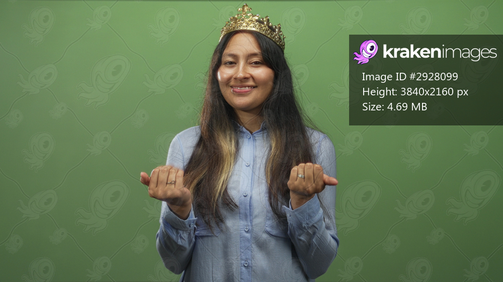 Young latina brunette woman wearing a gold crown beckoning with fingers in green studio; confidence empowerment.