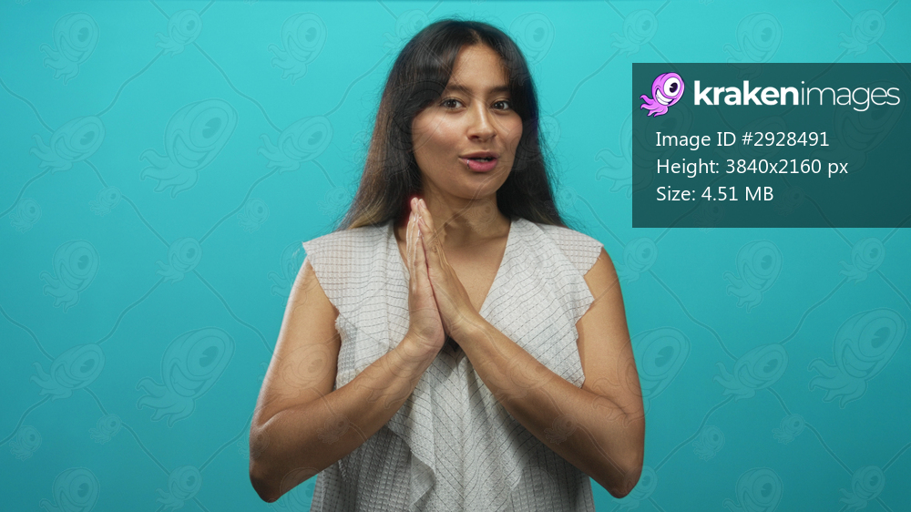 Young latina brunette woman wearing white sleeveless top with hands covering mouth and palms pressed together in studio turquoise backdrop; surprise reflection. - Kraken Images