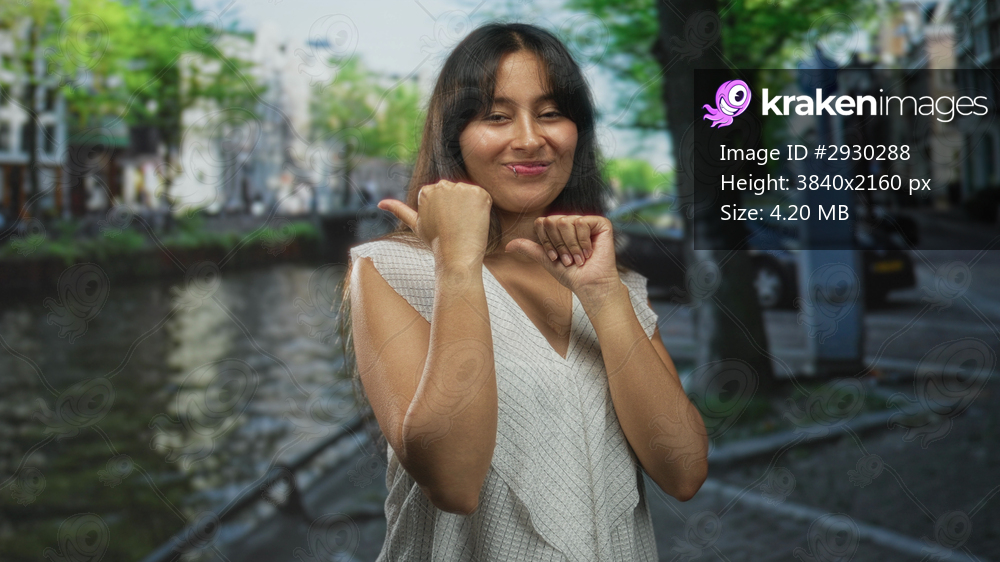 Young latina woman with bare arms and thumbs pointing to chest on a canal street in amsterdam; playful confidence.