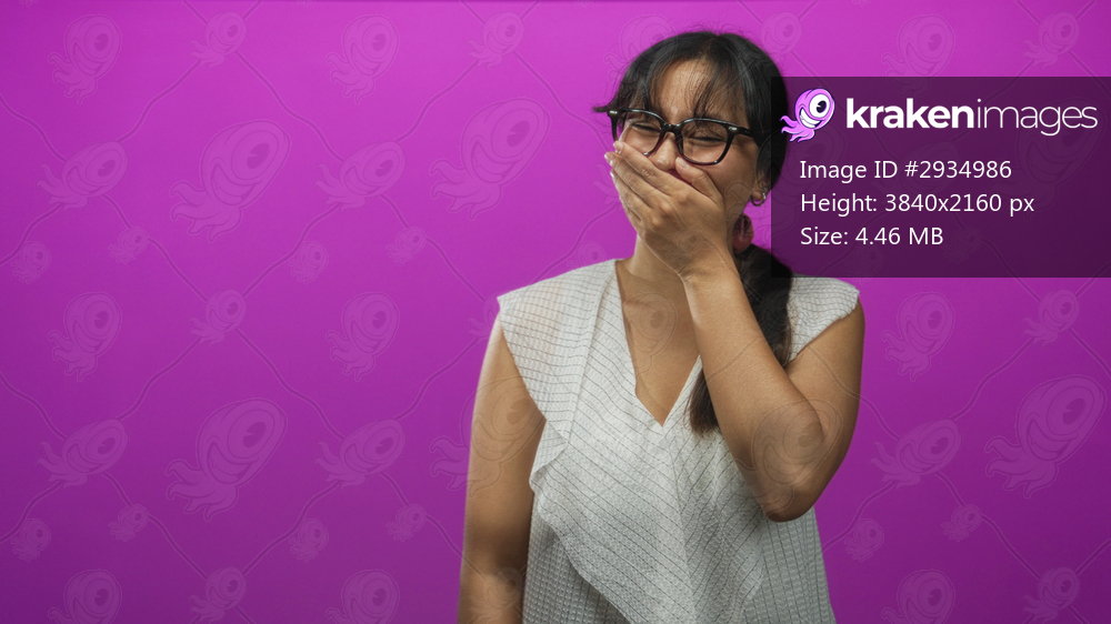 Young latina woman brunette wearing glasses smiling and laughing while pointing finger at camera in magenta studio; joyful connection.