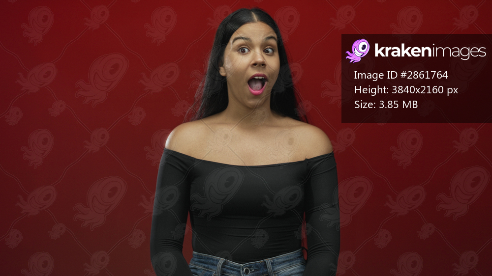 Young latina woman crosses arms with bare shoulders visible in studio against red background; rejection.