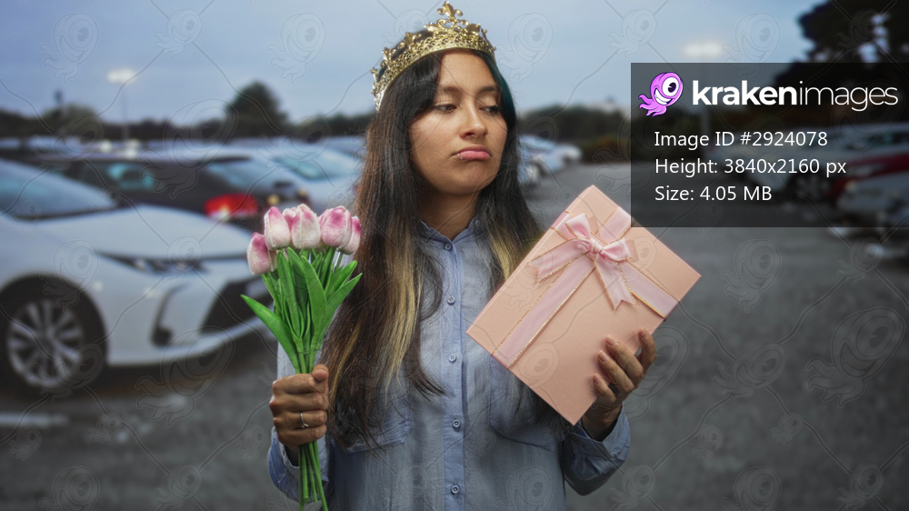 Young latina woman with crown holding pink tulip bouquet and wrapped gift box, pouts lips while standing near parked cars on street; disappointment.