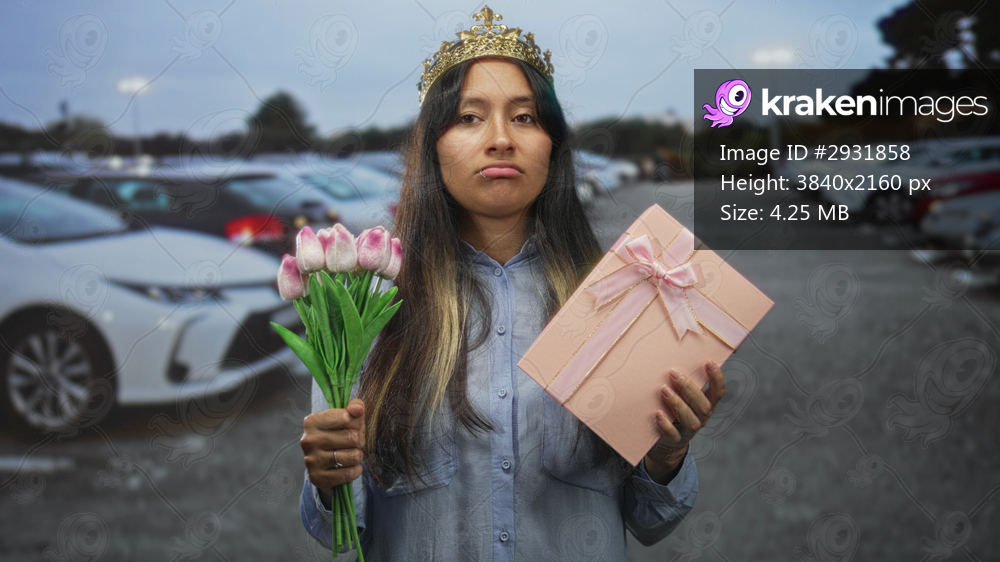 Young latina woman with crown holding pink tulip bouquet and wrapped gift box, pouts lips while standing near parked cars on street; disappointment.