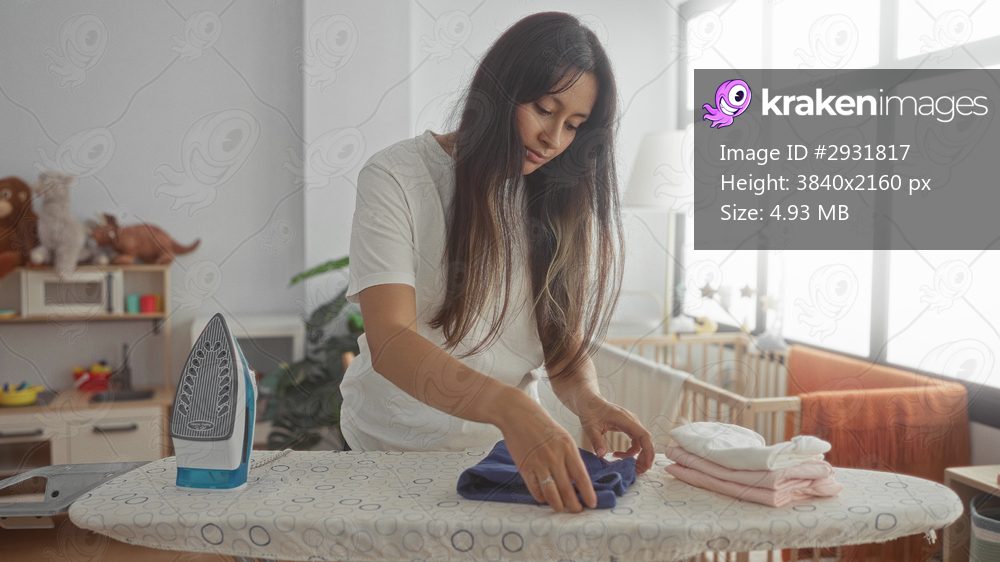 Young latina woman folding baby clothes on an ironing board with iron and stacked garments beside a crib in a nursery building; motherhood care calm.