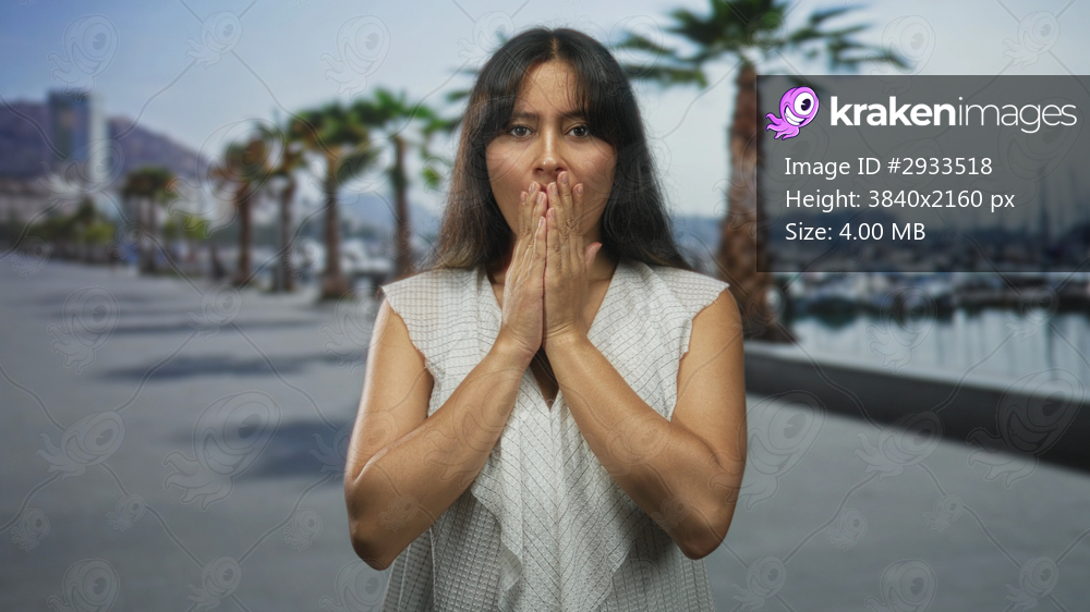 Young latina woman with hands covering mouth and clasped fingers standing on a street near port boats and palm trees by a marina; surprise empathy.