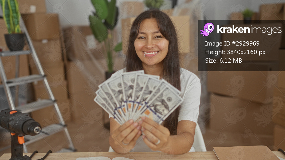 Young latina woman holding a fan of cash and smiling inside a building with moving boxes and a drill on the table; financial freedom joy.