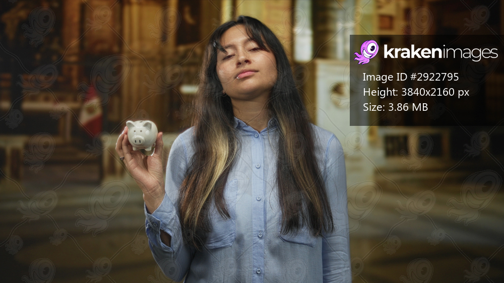 Young latina woman holding a white piggybank and looking down in an ornate church interior with raised hand; money concern.