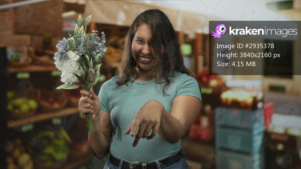 Young latina woman holding bouquet of flowers with her right hand while smiling and touching her hair at an outdoor fruit market stall under a canopy; joy. - Kraken Images