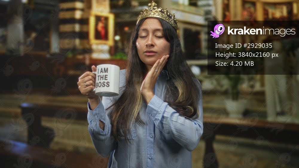 Young latina woman holding mug with text i am the boss and hand on cheek in church building; contemplation irony.