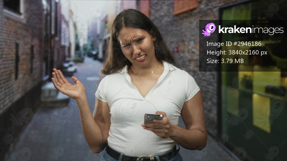 Young latina woman holding smartphone with puzzled frown, tapping screen and shrugging one hand in narrow city street; digital frustration.
