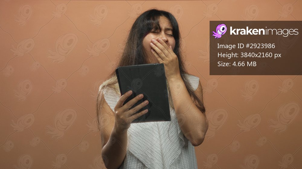 Young latina woman holding tablet and covering mouth with hand in studio peach backdrop; tiredness distraction.