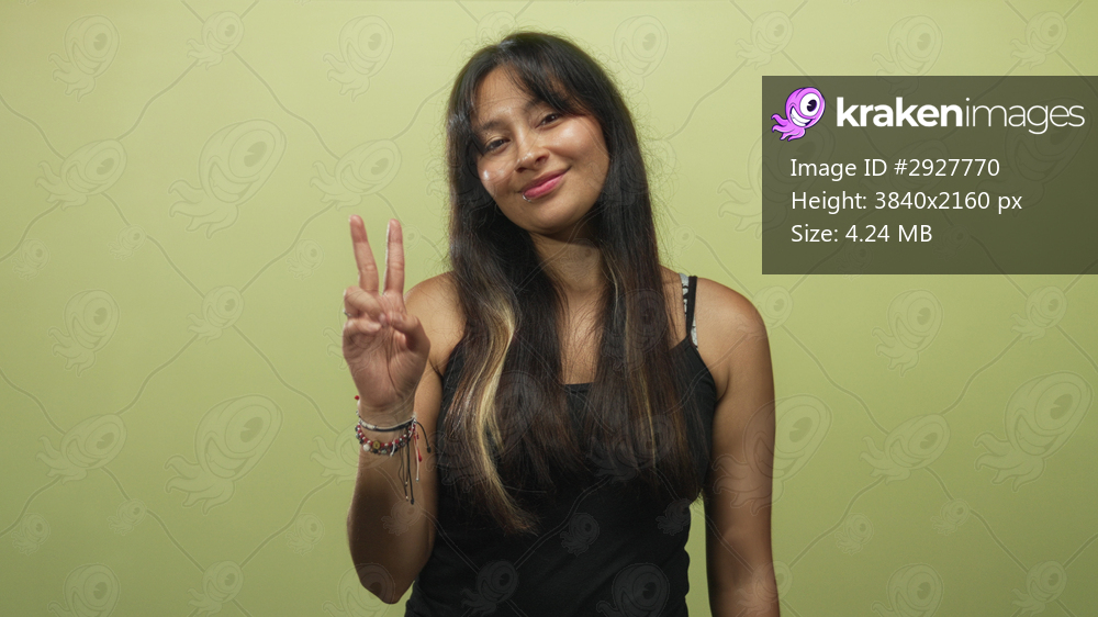 Young latina woman holding up two fingers peace sign with hand in studio against light green backdrop; peace.