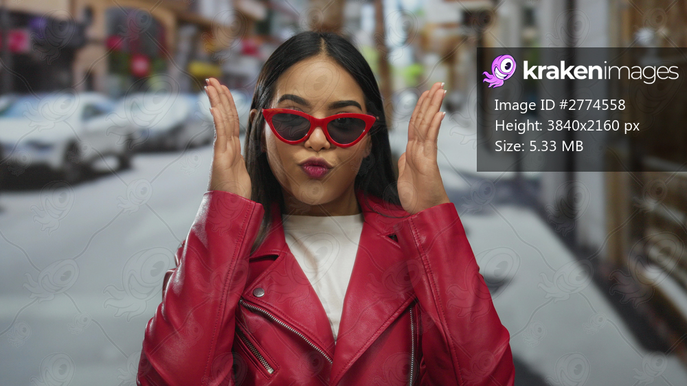 Young latina woman in red jacket and sunglasses poses confidently in an urban street setting, surrounded by buildings and cars, capturing a vibrant and modern vibe. - Kraken Images